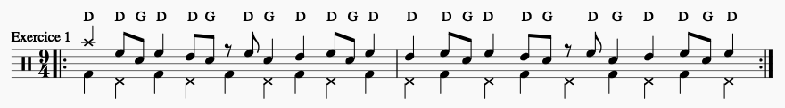 Exercice 1 : Jeu entre le tom alto et le tom aigu d’une main et l’autre sur la caisse claire avec les pieds « en pompe »