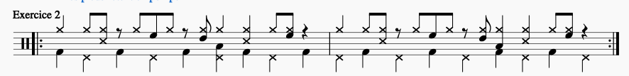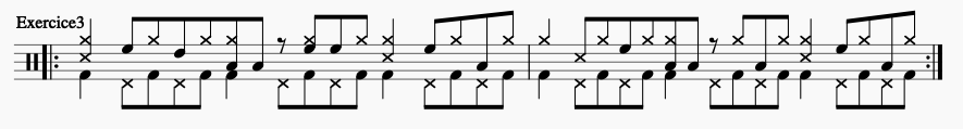 Exercice 3 : Rythme en 3 temps à la cymbale (comme un chabada par dessus la figure rythmique) et le schéma rythmique du (1 3 2 2 1 3) est joué entre une main répartie sur les toms et le rebord de la caisse claire. Les pieds suivent le mouvement de la cymbale.
