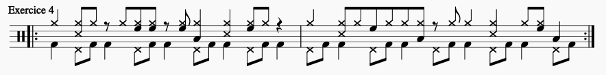 Exercice 5 : La charleston au pied joue les pulsations à la noire pendant que la grosse caisse joue le shéma rythmique (1 3 2 2 1 3). Les mains jouent un mouvement à la croche en frisé entre la cymbale à la blanche et un débit de croches entre la caisse claire et les toms.
