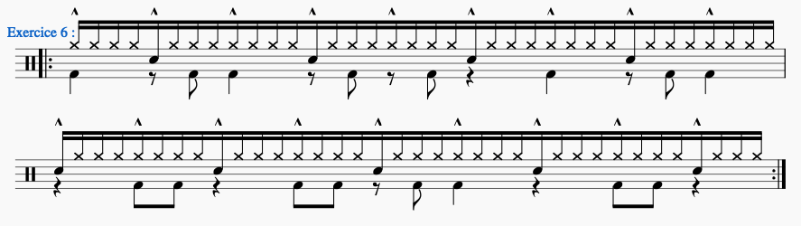 Exercice 6 : Les 2 mains en frisé sur la charleston fermée avec déplacement sur la caisse claire une noire sur 2. la grosse caisse joue le schéma rythmique (1 3 2 2 1 3) en complément de la caisse claire.