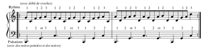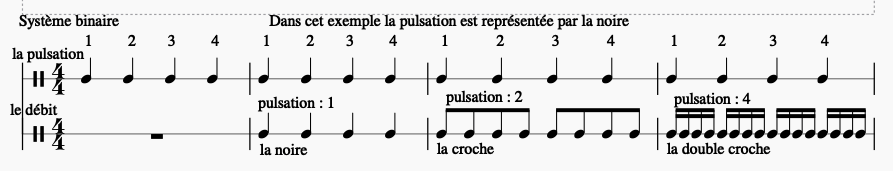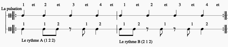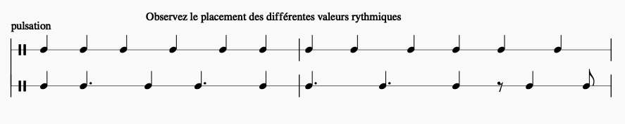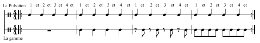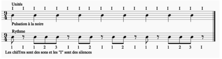 Mais il ne faut pas oublier que chaque groupe de sons est séparé d’une unité de silence afin de bien discerner chaque groupe (sinon nous entendrions une succession de sons identiques et cela deviendrait une pulsation et non plus un rythme !