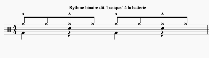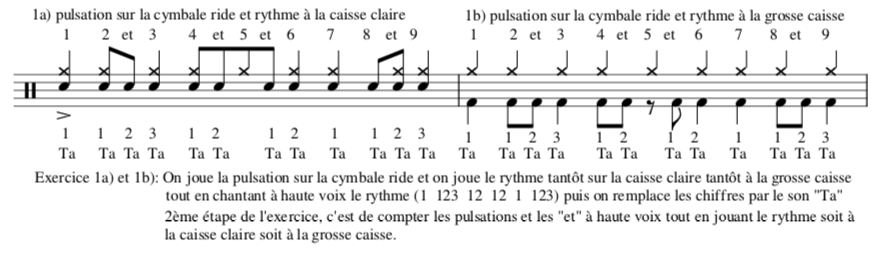 - Tout en chantant le rythme, on l’applique sur son instrument avec un seul son. Sur la caisse claire en frisé (alternance entre les 2 mains) pour les batteurs et sur un seul son pour les autres musiciens.