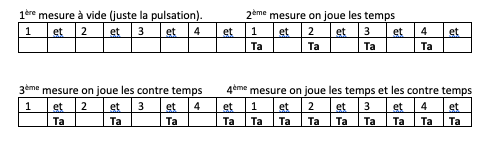 - Faire au mieux avec tout cela en attendant la 2ème partie qui sera plus musicale. Pratiquer régulièrement et changer régulièrement de rythme pour apprivoiser cette façon de faire. Peu à peu les rythmes auront moins de secrets pour vous. Rester dans un mode ludique, travailler lentement et en cas de soucis nous nous appelons.