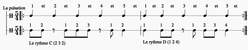 C’est le moment théorique qui consiste à bien comprendre le lien mathématique qui lie le rythme à sa pulsation. Le premier objectif c’est de pouvoir comprendre et de faire le lien entre le rythme et cette « fameuse » pulsation puis de l’écrire à sa façon. Ensuite, dans un deuxième temps c’est de pouvoir le transcrire avec les symboles musicaux en vigueur (les noires, les croches, les silences…).