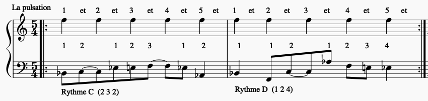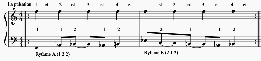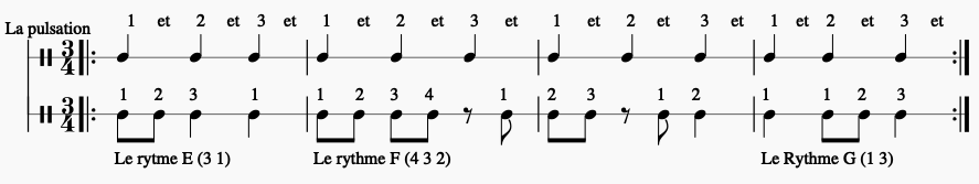 2 À partir de l’exemple précédent, construisez une mélodie issue des rythmes ainsi qu’une partie de basse liée à la pulsation de référence.