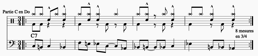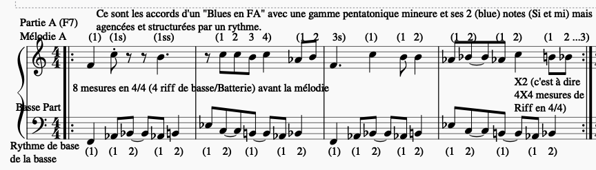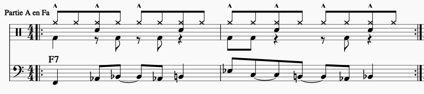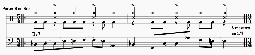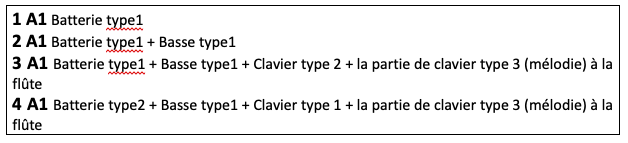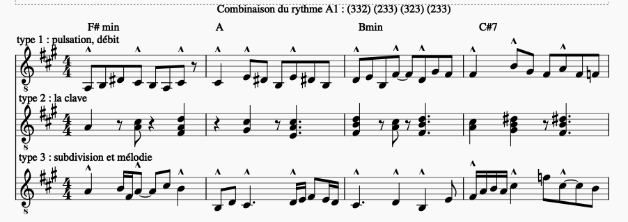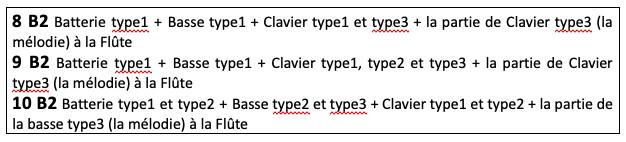 - Partie de Clavier ou de guitare soumise au schéma rythmique A1, B1, A2, B2, déclinée pour 3 rôles différents :