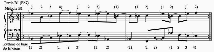 - Construction de la partie de Basse soumise au schéma rythmique A1, B1, A2, B2, déclinée pour 3 rôles différents :