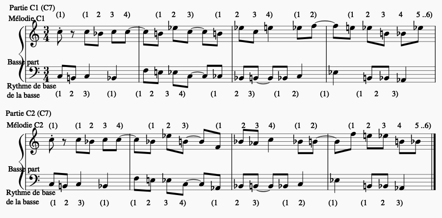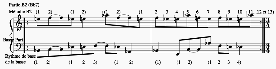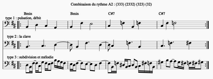 Les rythmes correspondants aux parties A1, B1, A2 et B2 de la basse de type 3 (mélodie et subdivision rythmique) :