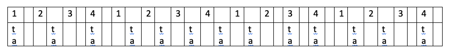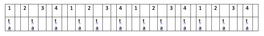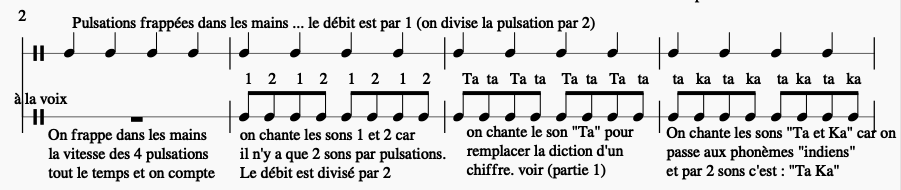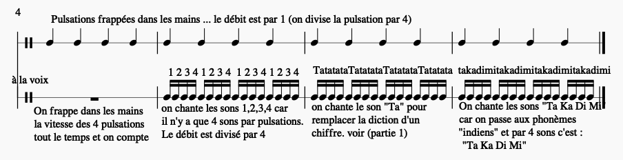 Commençons à chanter cette succession de chiffres en boucle en les mémorisant (important !) Puis peu à peu, nous transformerons la diction des chiffres par un son : (phonème) avec le son « Ta » ou le son « TI » (bien garder les consonnes qui ont de l’attaque comme t, p, k, … (il faut un son net et percutant ! ).