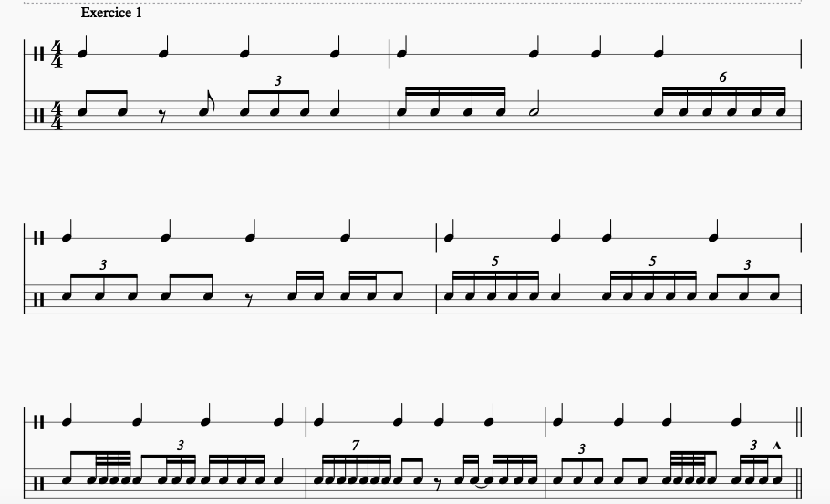 - Comme pour l’exercice précédent mais avec l’aide d’un métronome ou d’une boîte à rythme tout en chantant le rythme et en le jouant.