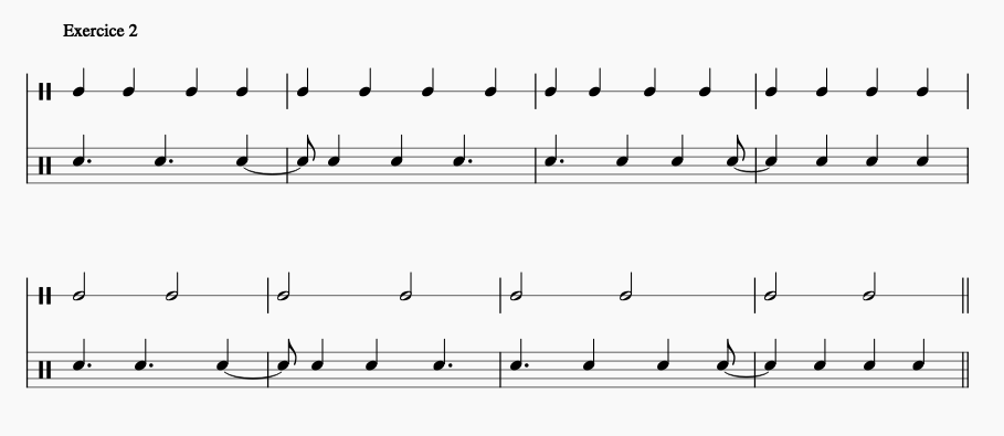 4 À partir de l’exercice 2, réécrivez le rythme de l’exercice 2 en utilisant des équivalences rythmiques qui correspondront aux noires pointées ou aux noires.