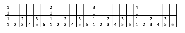On peut tout de suite commencer à chanter cette phrase de chiffres en boucle. C’est un rythme ! Un rythme basique et uniforme, mais c’est un rythme et non pas une pulsation car les sons (représentés par des chiffres) ne sont pas à la même distance les uns des autres.