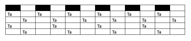 - Mémoriser et chanter les rythmes à hautes voix d’abord avec les chiffres, puis avec le son « Ta ».