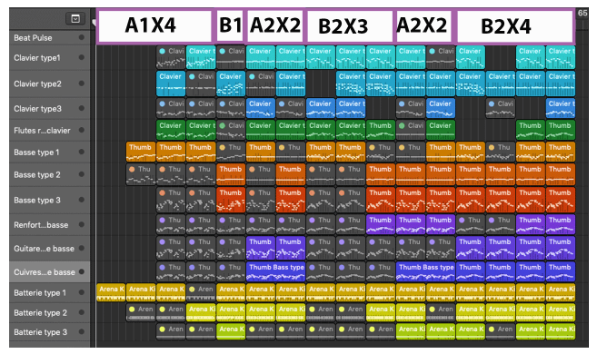 Nous avons donc créer 4 parties distinctes (A1, B1, A2 et B2) qui sont déclinées en trois types d’interprétations pour la batterie, la basse et le clavier. Nous avons donc 12 parties différentes pour chaque instrument, ce qui nous donne 36 parties à agencer.
