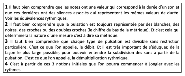 Pour résumer, ce qu’il est important de comprendre au travers de cette 4ème partie, il faut bien assimiler différentes notions rythmiques qui sont en lien les unes aux autres :