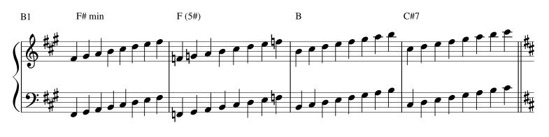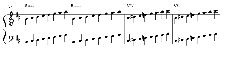 Les gammes en relation avec les accords des parties A1, B1, A2 et B2 :