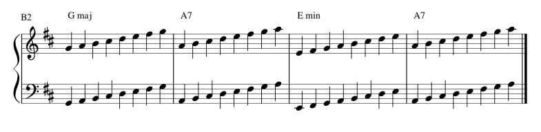 La 2ème sera dans une tonalité voisine à partir de la gamme de Re majeur avec 2# à l’armure, correspondra aux parties A2 et B2.